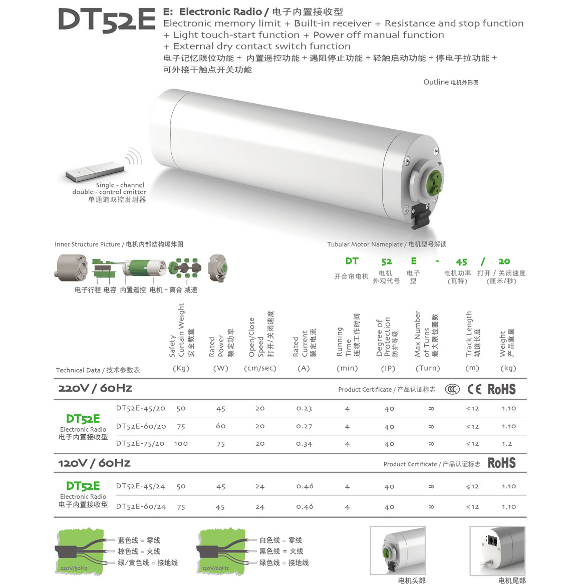 電子記憶限位功能+內置遙控功能+遇阻停止功能+輕觸啟動功能+停電手拉功能+第三行程點功能+可外接干觸點開關功能