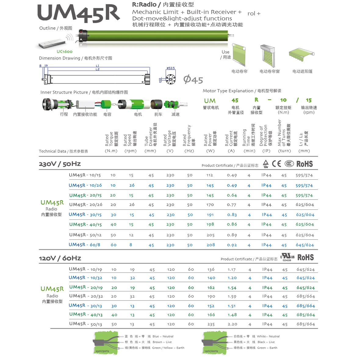 R:Radio/內置接收型 機械行程限位+內置接收器+點動調光功能
